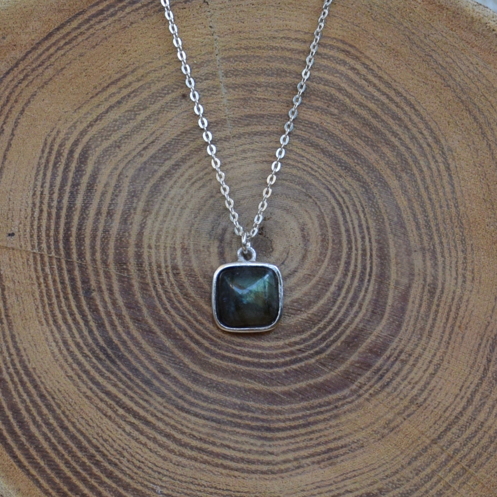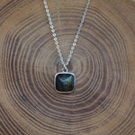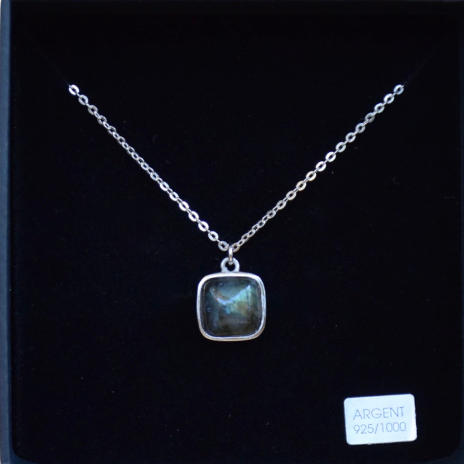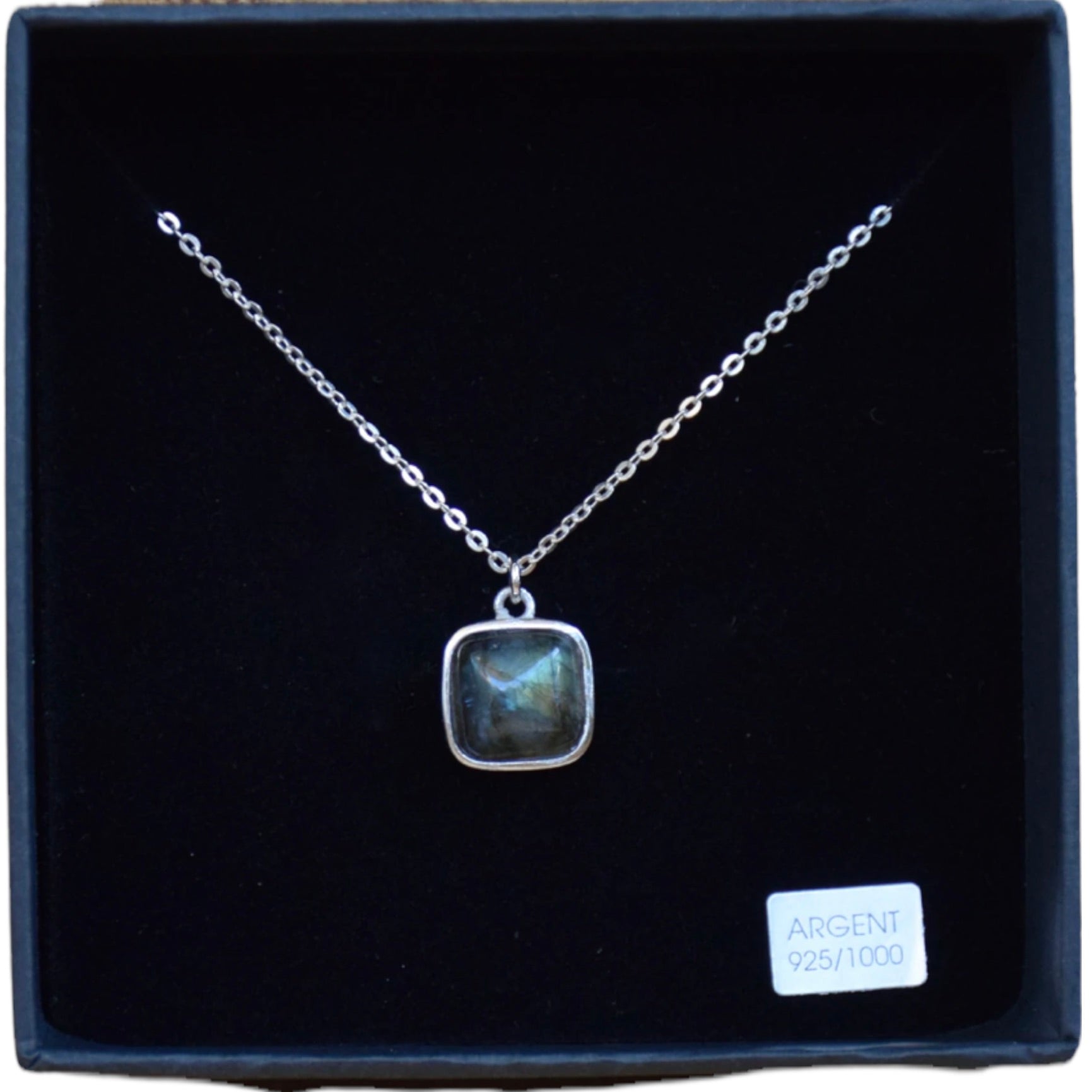 • Pendentif Labradorite serti d'argent 925/1000, monté sur chaine et fermoir en argent 925/1000.
