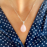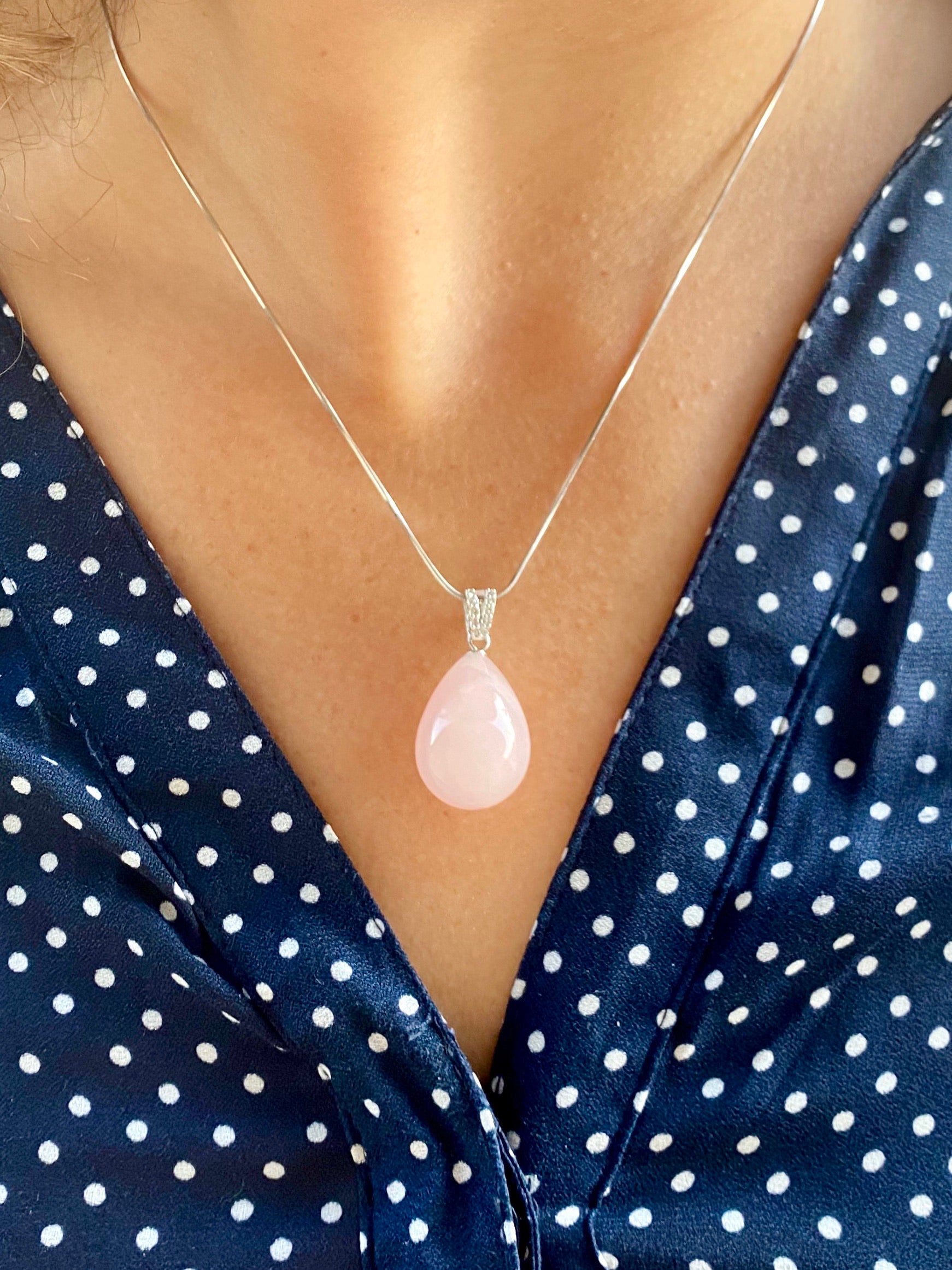 • Magnifique pendentif en quartz rose avec bélière tout en argent et strass rhodié.