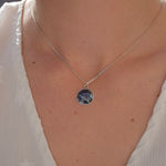 • Pendentif en sodalite serti d'argent 925/1000 monté sur chaine et fermoir en argent 925/1000.