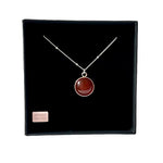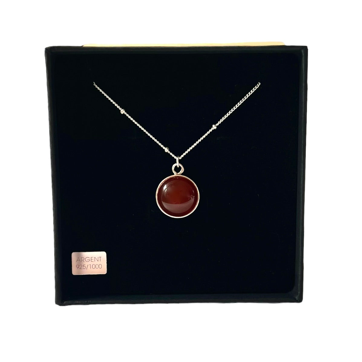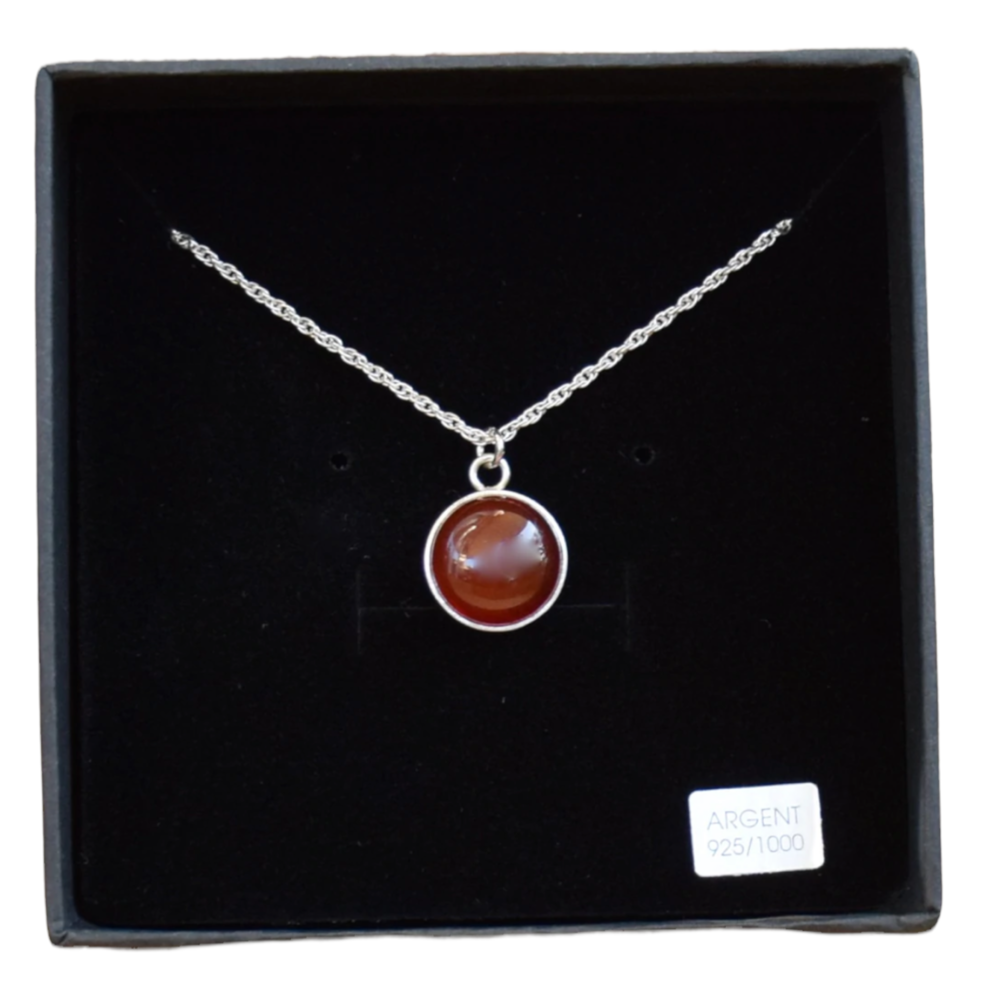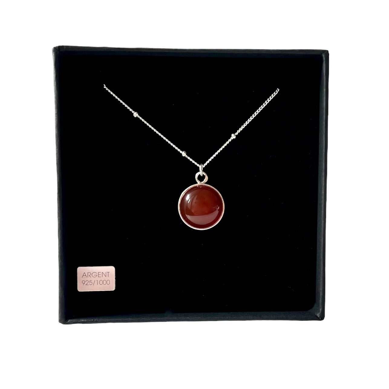 • Pendentif en cornaline serti d'argent 92/1000 monté sur chaine et fermoir en argent 925/1000.