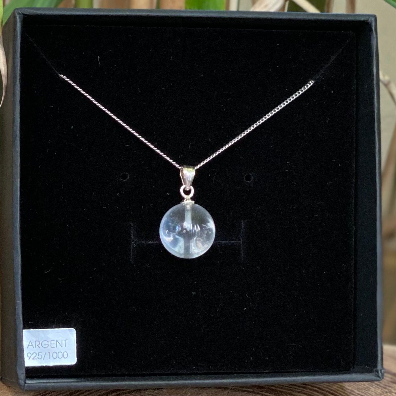 Pendentif en cristal de roche 12mm , monté sur chaine et fermoir en argent 925/1000